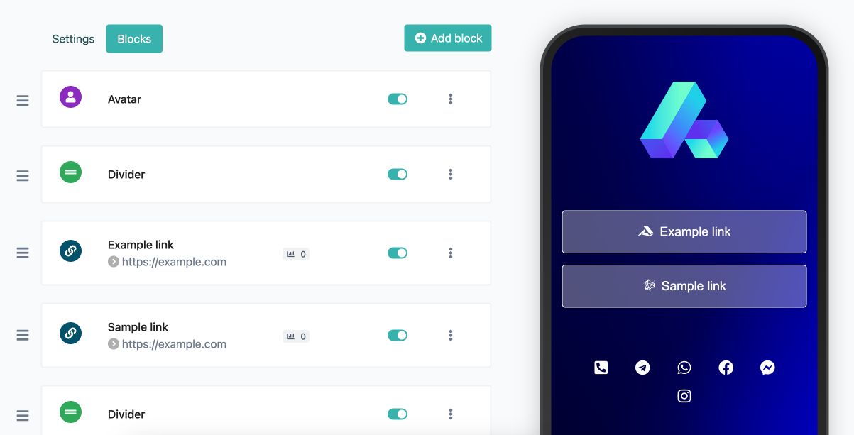 Shorten URLs, create bio link pages, custom QR codes, vcard links, file links & more.